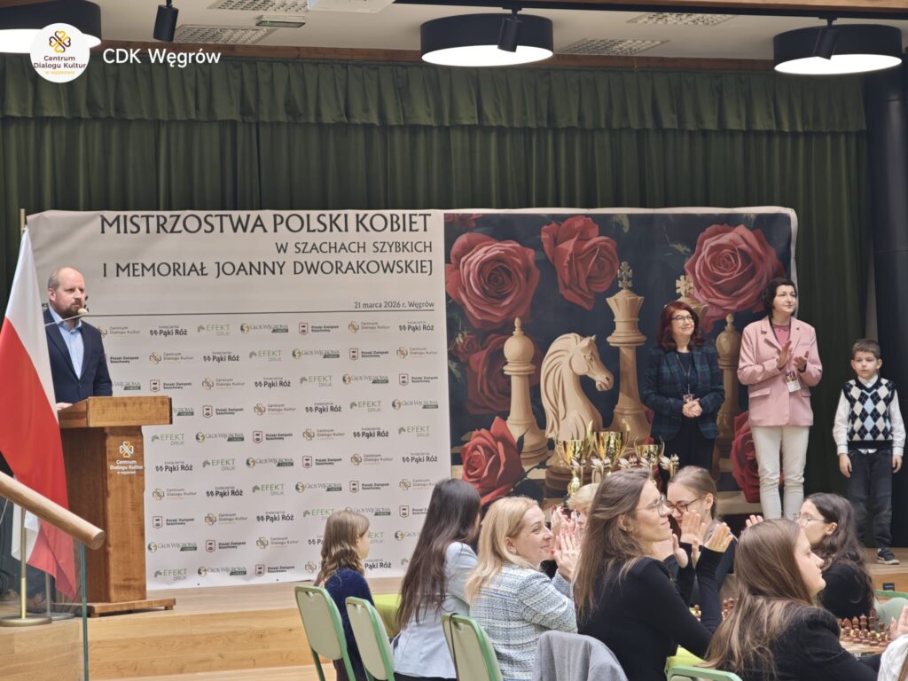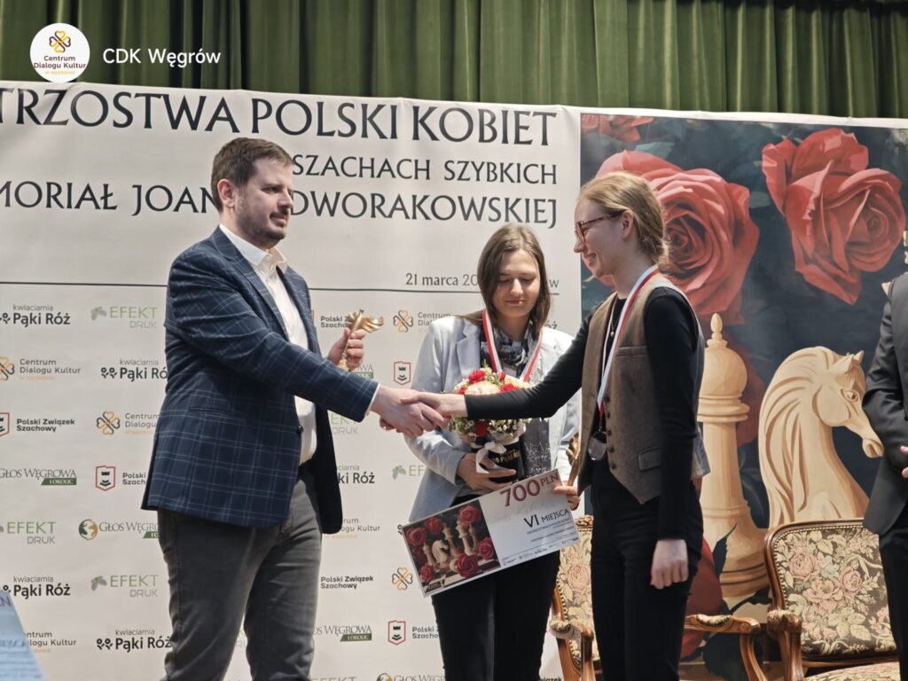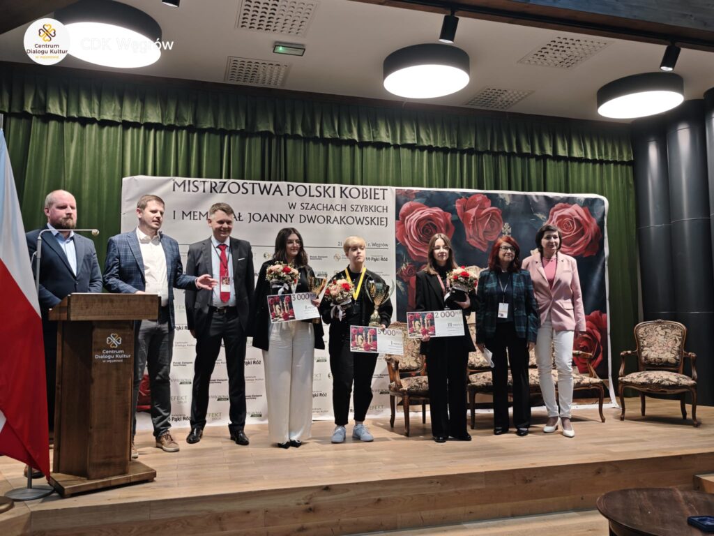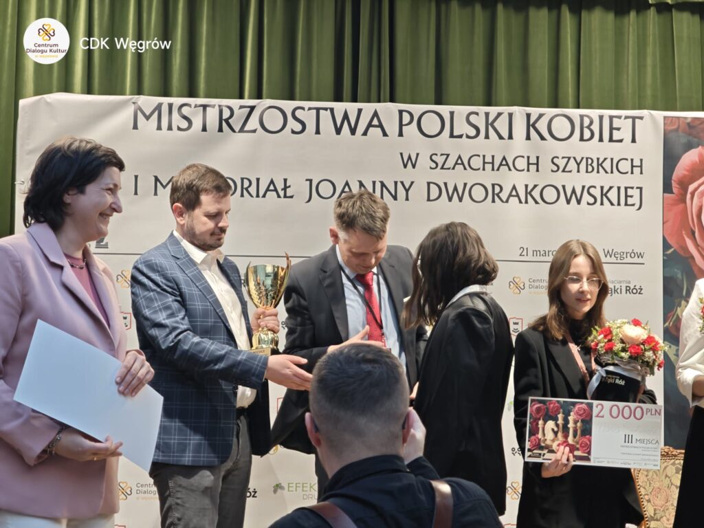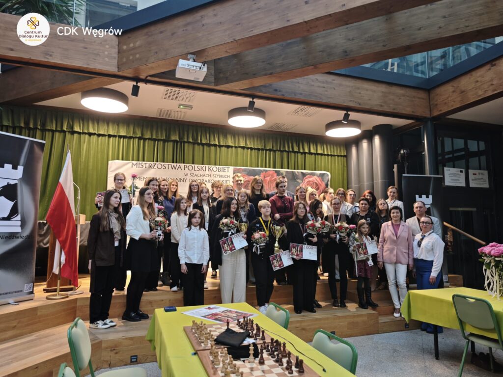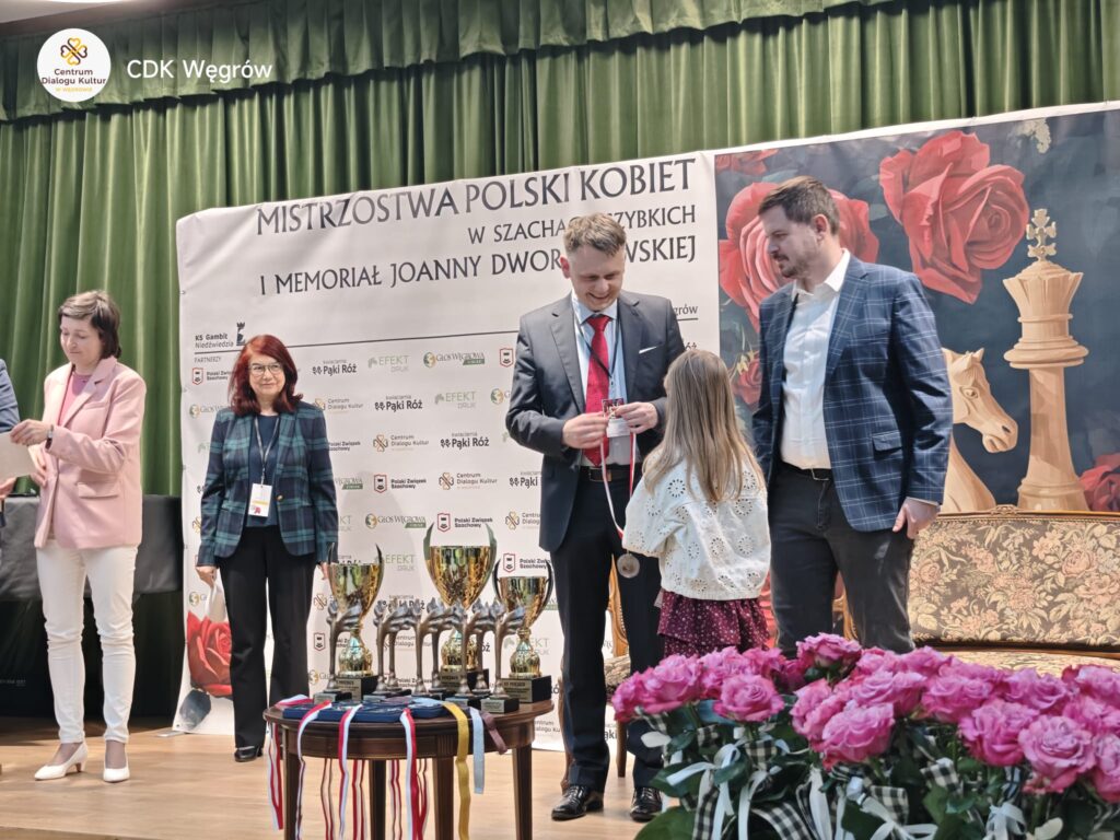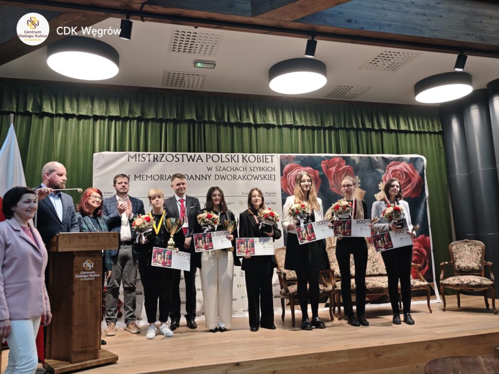 Dzisiaj odbyły się Mistrzostwa Polski Kobiet w Szachach Szybkich – I Memoriał Joanny Dworakowskiej, którego organizatorem był KS Gambit Niedźwiedzia. Do Węgrowa przyjechała bardzo utalentowana grupa zawodniczek z całej Polski, które mają już na swoim koncie znaczące sukcesy. Poniżej przedstawiamy listę laureatów, którym medale, puchary oraz nagrody wręczył min. Radosław Jedynak – Prezes Polski Związek Szachowy: