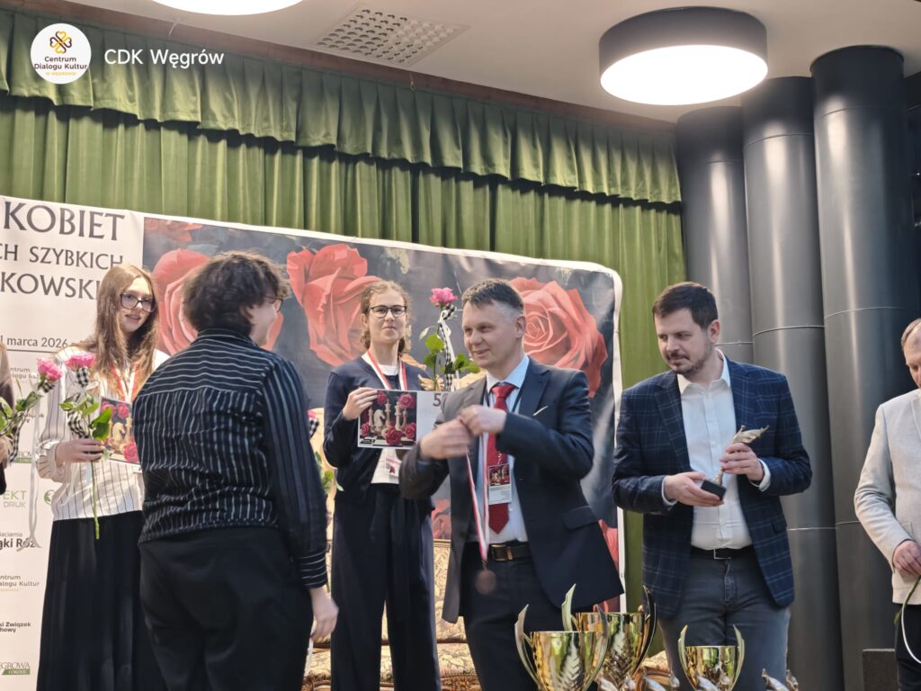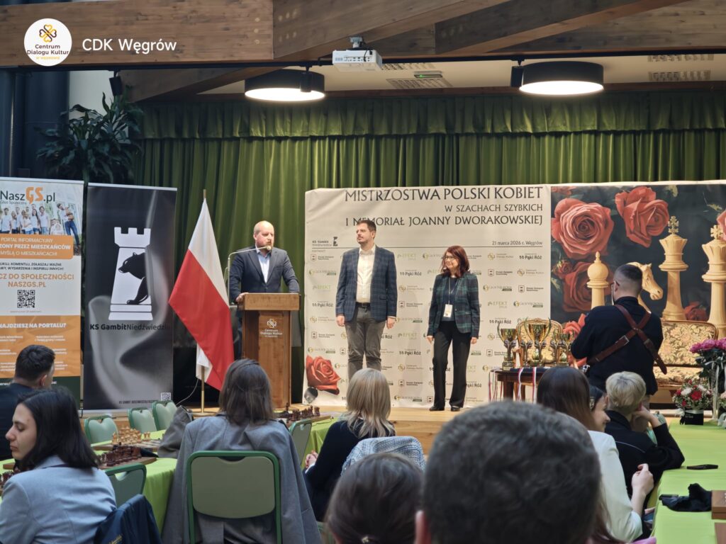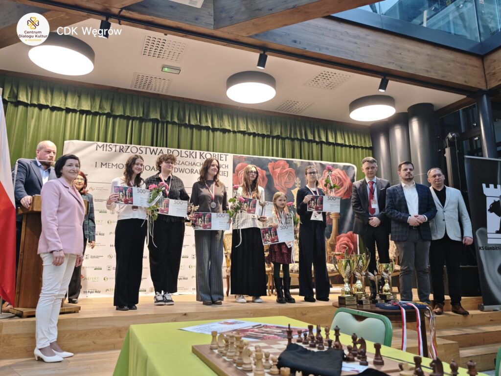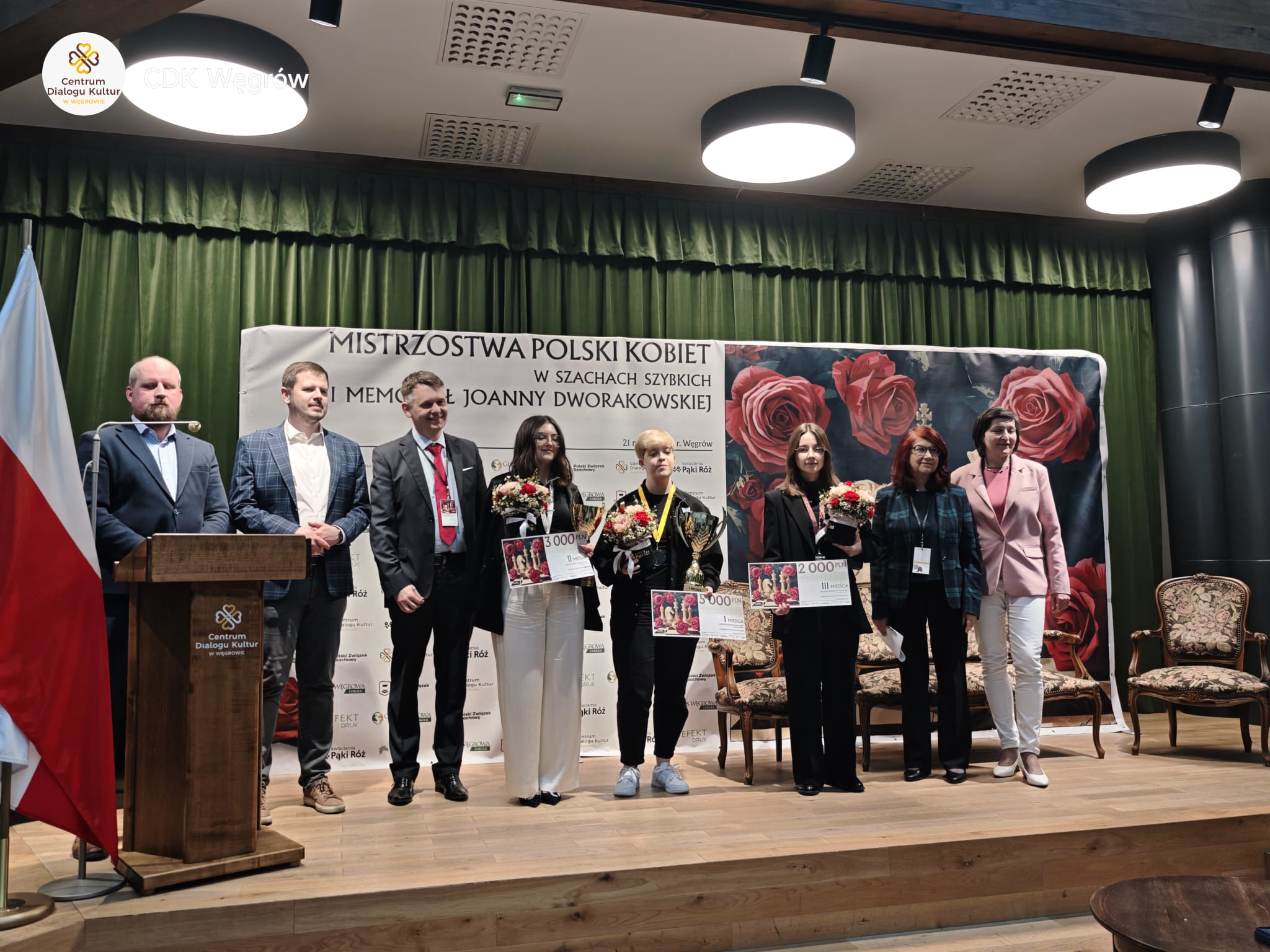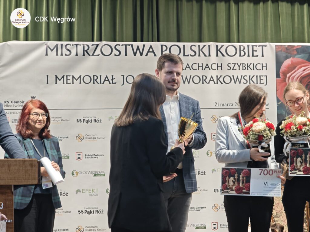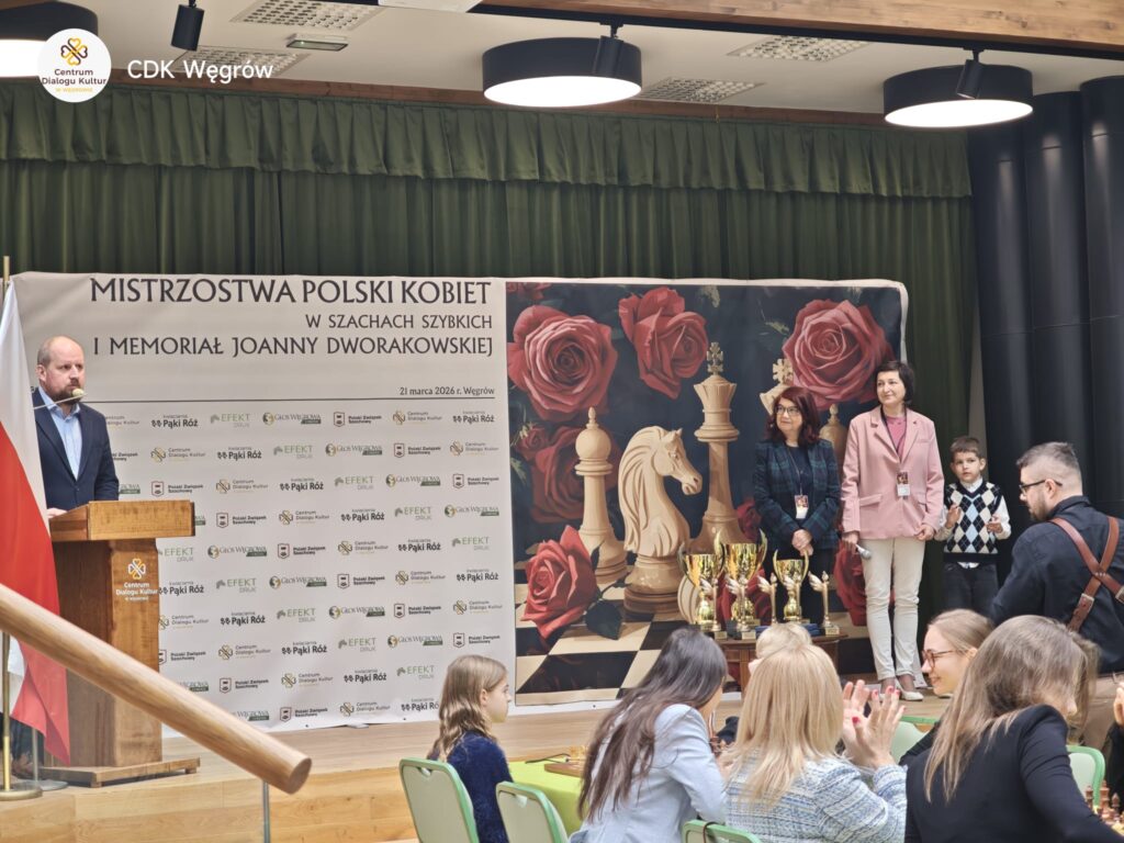 Dzisiaj odbyły się Mistrzostwa Polski Kobiet w Szachach Szybkich – I Memoriał Joanny Dworakowskiej, którego organizatorem był KS Gambit Niedźwiedzia. Do Węgrowa przyjechała bardzo utalentowana grupa zawodniczek z całej Polski, które mają już na swoim koncie znaczące sukcesy. Poniżej przedstawiamy listę laureatów, którym medale, puchary oraz nagrody wręczył min. Radosław Jedynak – Prezes Polski Związek Szachowy: