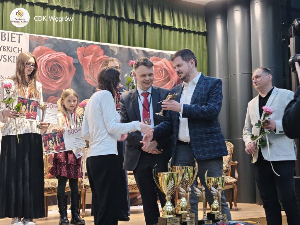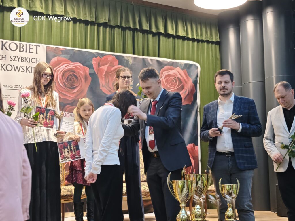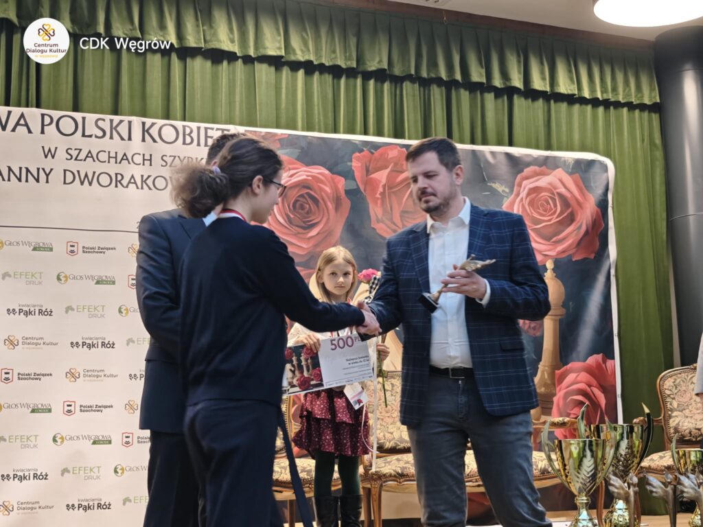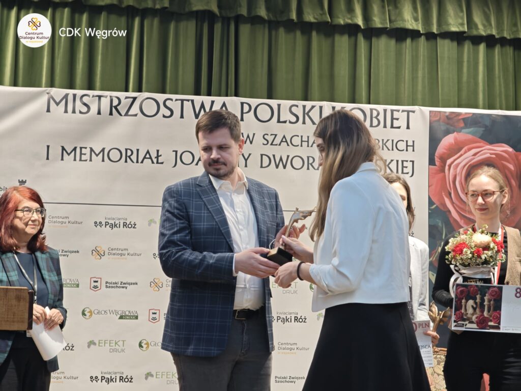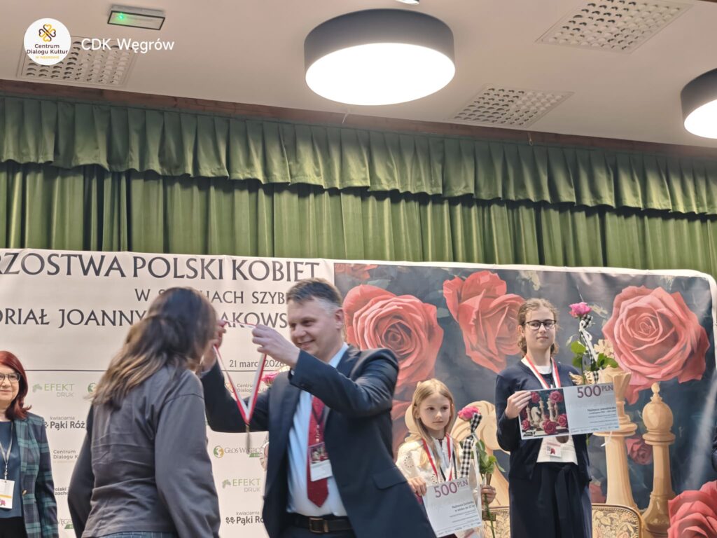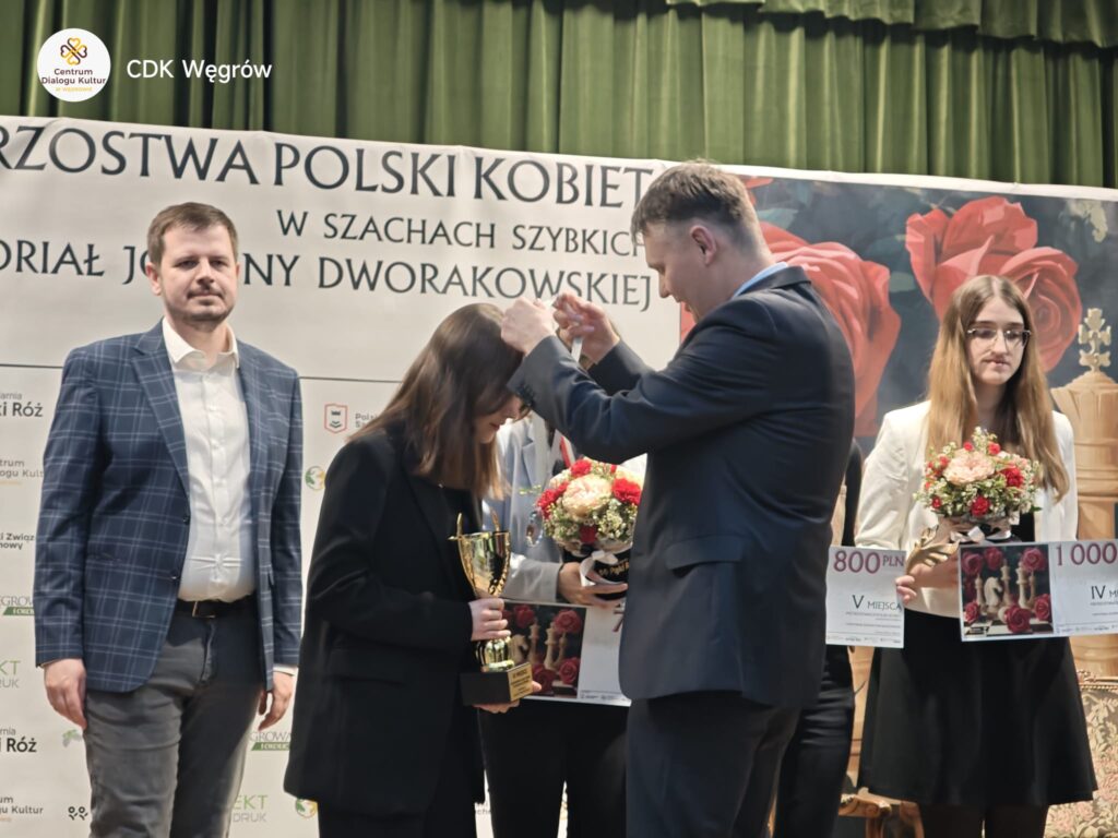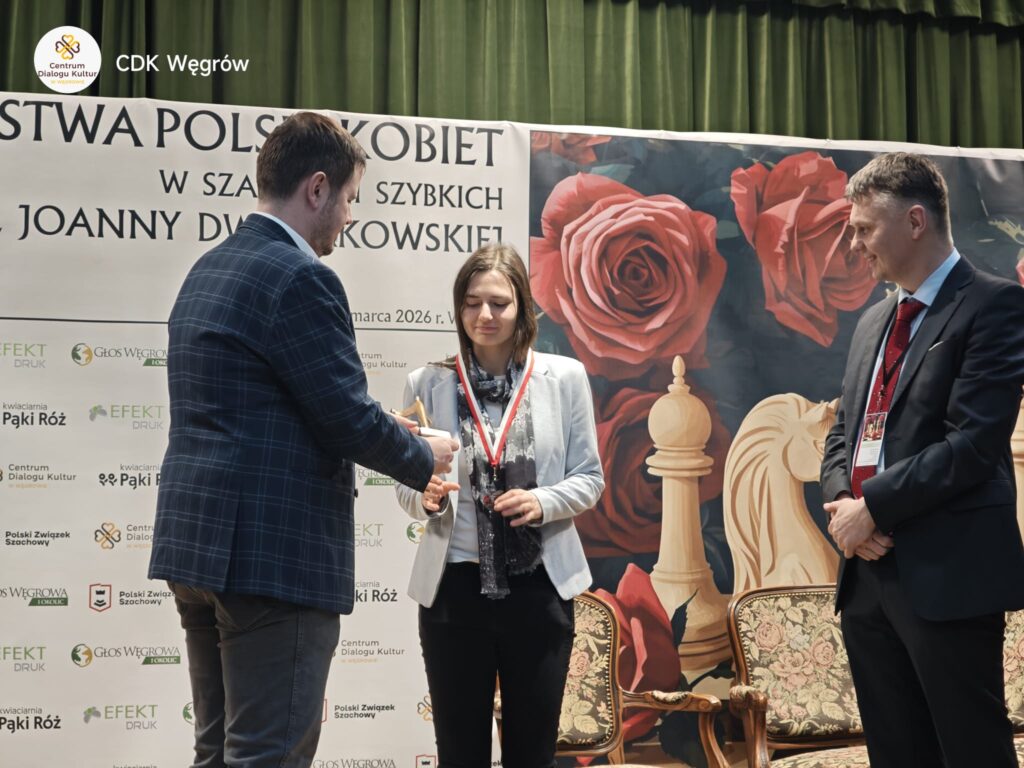Dzisiaj odbyły się Mistrzostwa Polski Kobiet w Szachach Szybkich – I Memoriał Joanny Dworakowskiej, którego organizatorem był KS Gambit Niedźwiedzia. Do Węgrowa przyjechała bardzo utalentowana grupa zawodniczek z całej Polski, które mają już na swoim koncie znaczące sukcesy. Poniżej przedstawiamy listę laureatów, którym medale, puchary oraz nagrody wręczył min. Radosław Jedynak – Prezes Polski Związek Szachowy: