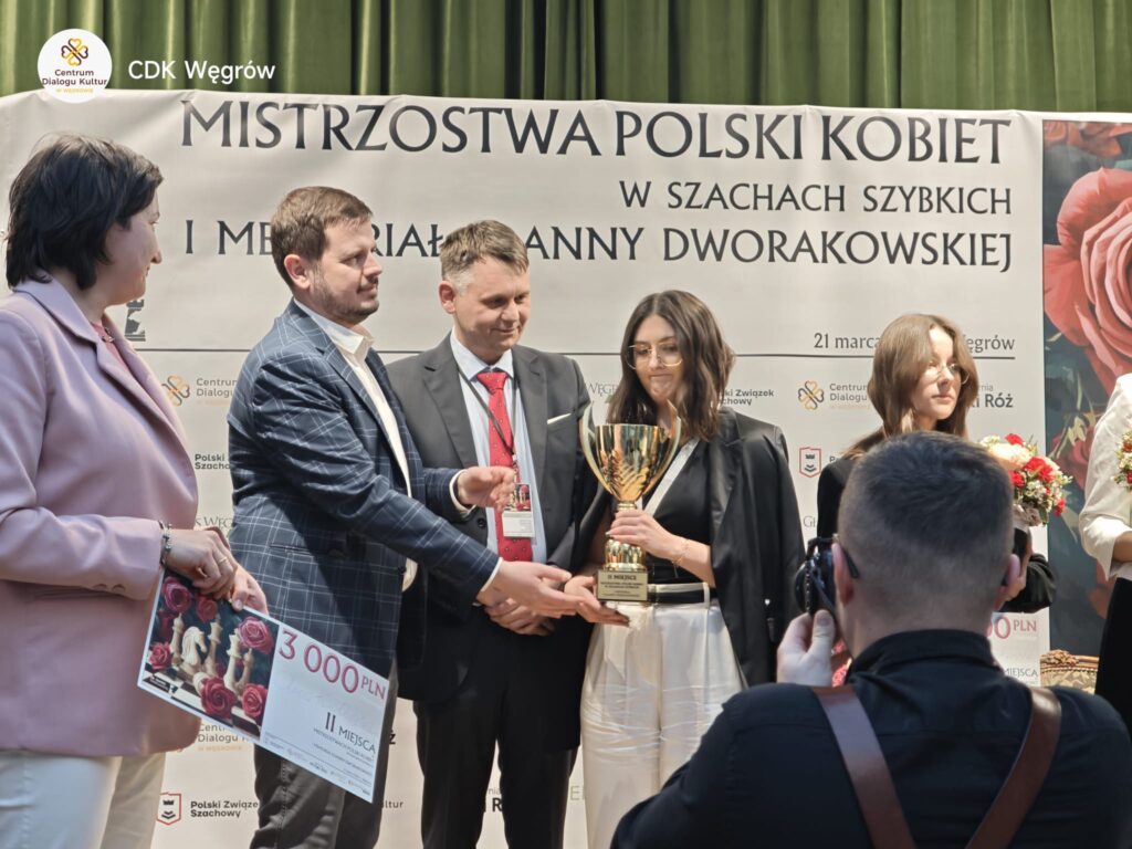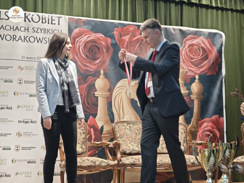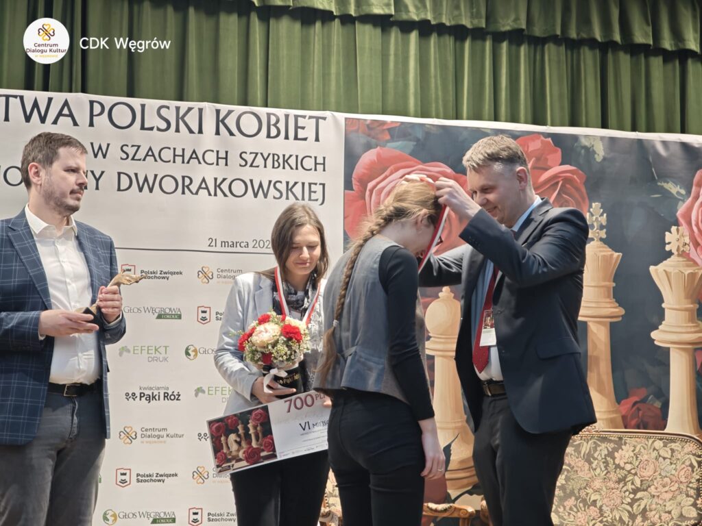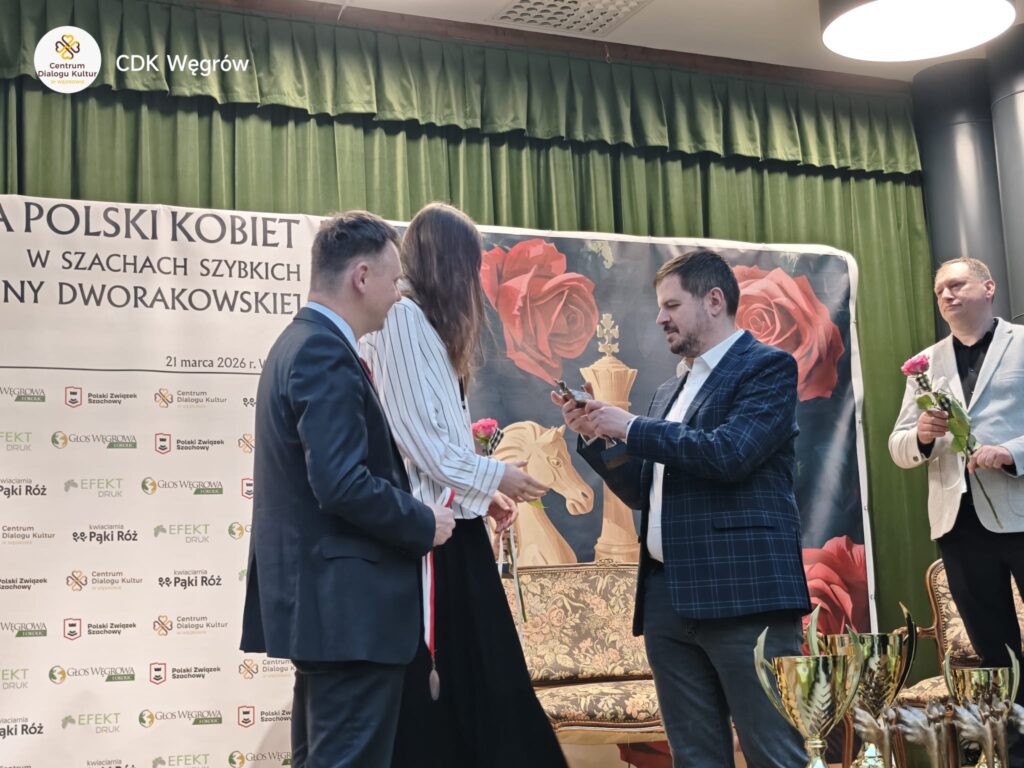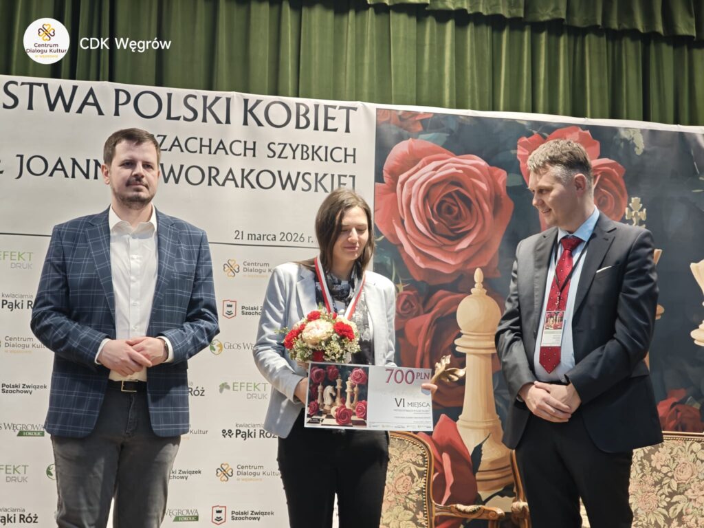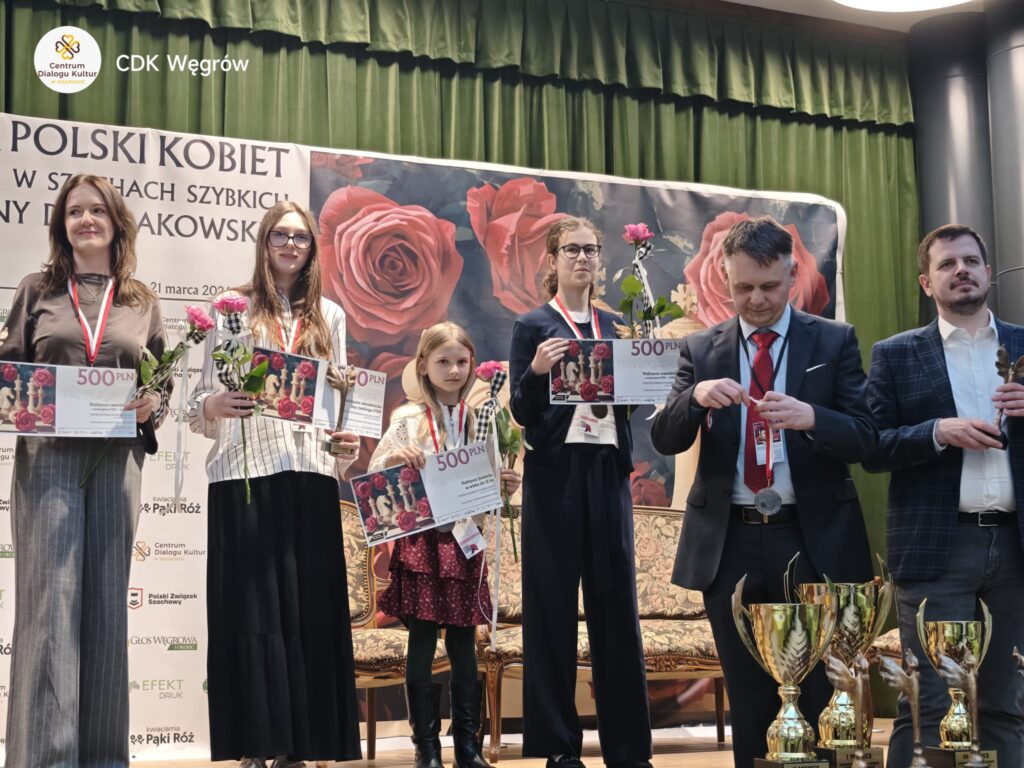 Dzisiaj odbyły się Mistrzostwa Polski Kobiet w Szachach Szybkich – I Memoriał Joanny Dworakowskiej, którego organizatorem był KS Gambit Niedźwiedzia. Do Węgrowa przyjechała bardzo utalentowana grupa zawodniczek z całej Polski, które mają już na swoim koncie znaczące sukcesy. Poniżej przedstawiamy listę laureatów, którym medale, puchary oraz nagrody wręczył min. Radosław Jedynak – Prezes Polski Związek Szachowy: