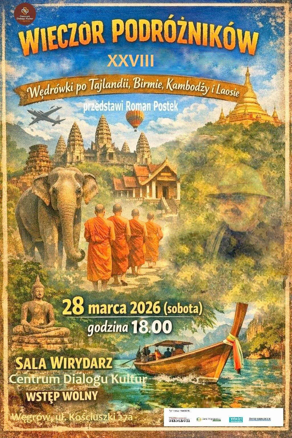Kraje Dalekiego Wschodu są fascynujące dla ludzi z Europy, dzięki swej odmienności, a każdy z nich wyróżnia się oryginalną kulturą, zabytkami i tradycjami historycznymi. Angkor Wat: słowo będące symbolem tajemniczości i egzotyki; pałace i świątynie Bangkoku; zmieniające się krajobrazy nad Mekongiem płynącym pomiędzy Tajlandią i Laosem; kompletnie magiczna i prawie nieznana Birma – te wszystkie klimaty, wrażenia i widoki (na licznych slajdach) spróbuje zmieścić, w półtoragodzinnym spotkaniu, gospodarz tego wieczoru Roman Postek.
