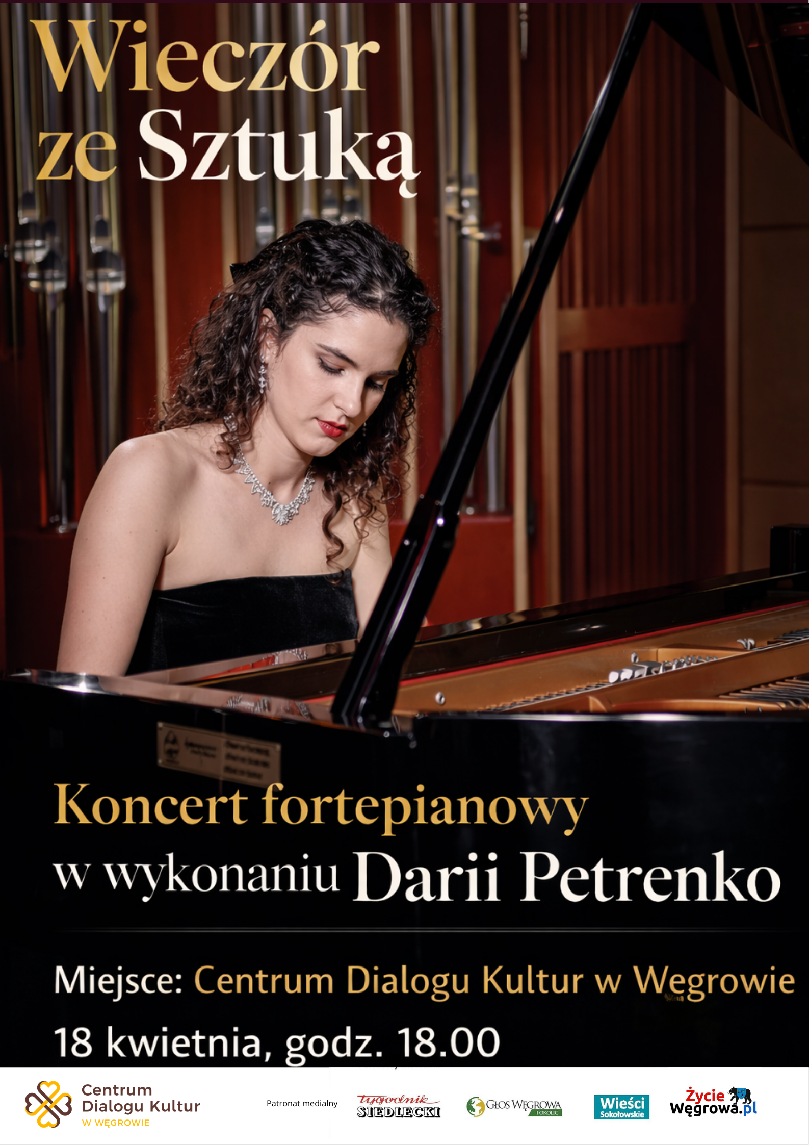 Wieczór ze Sztuką – Koncert fortepianowy Darii Petrenko + Dodaj do Google Calendar + iCal / Outlook export Data 18 kwietnia 2026 Zakończone! Czas 18:00 - 19:00 Poleć to wydarzenie